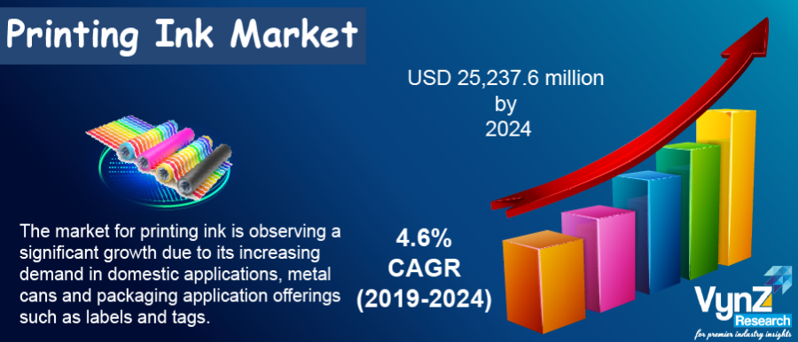 The global printing ink market is valued at USD 19,341.7 million in 2018 and is expected to reach USD 25,237.6 million by 2024. The market for printing ink is observing a significant growth due to its increasing demand in domestic applications, metal cans and packaging application offerings such as labels and tags. This market is expected to witness CAGR of 4.6% during 2019–2024 owing to robust scope for advertisement expenditure and incremental growth in label printing and packaging.